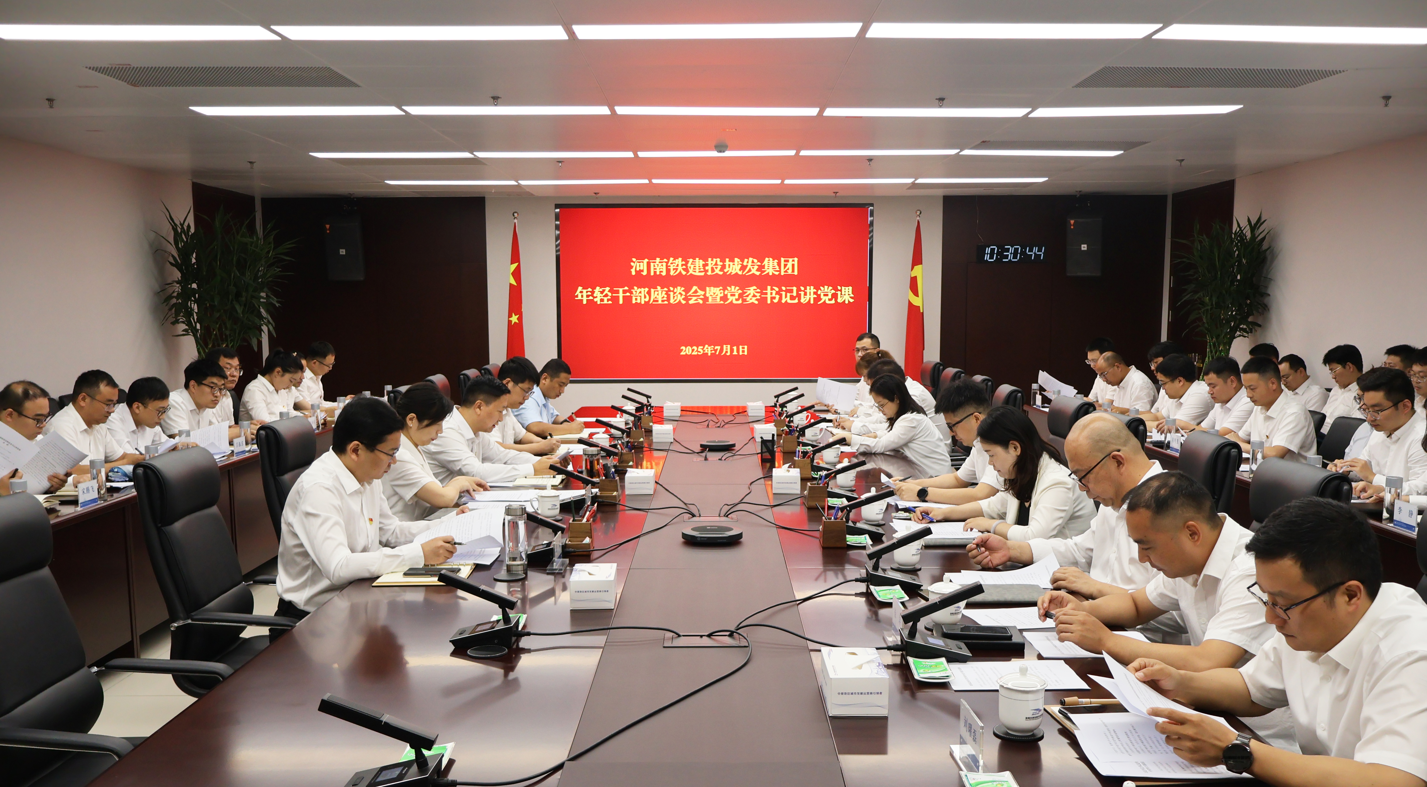 在中國共產黨成立104周年之際,7月1日,鐵建投城發集團黨委書記、董事長許會戰主持召開集團年輕干部座談會,作深入貫徹中央八項規定精神學習教育專題黨課。集團黨委副書記、紀委書記王兵兵主持。集團領導班子成員,各部門負責人,43名年輕干部參加會議。